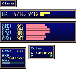 | EXP | Level: 117 EXP: 17506700 (for next level: 341195) Gain: 7687 EXP per post, 75.892 seconds to gain 1 EXP when idle |